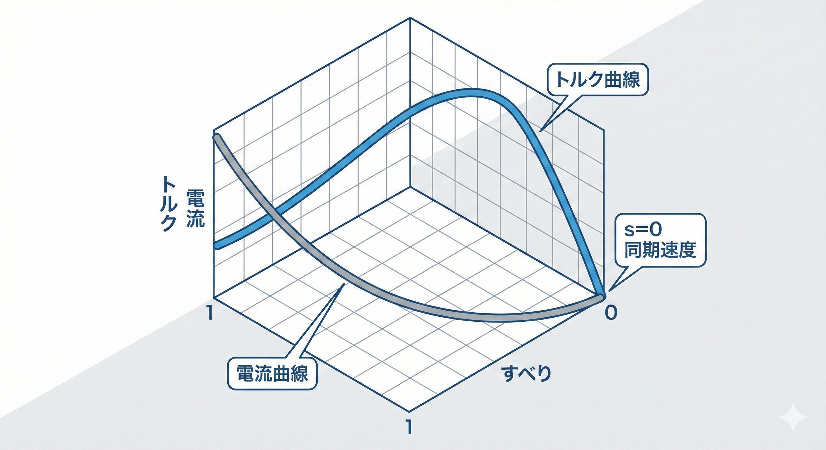 もしローターが同期速度と完全に同じ速度で回ったと仮定すると、ローター上の導体から見て磁界は相対的に静止していることになります。すると磁束を切断しなくなるため、誘導電流が発生せず、トルクもゼロになってしまいます。