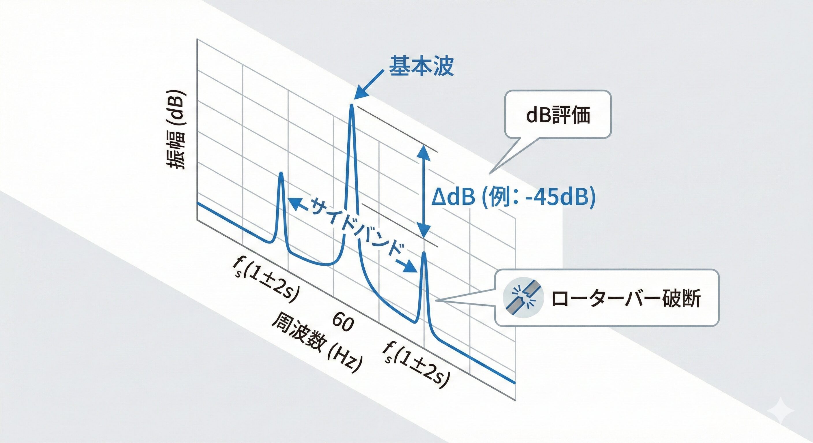 特に、かご形誘導電動機のローターバー破断の検知において業界標準となっています。過酷な始動などによってローターバーにクラックが入ると、ローター内の電流分布が不均一になり、逆相の磁界成分が発生します。これが固定子巻線に作用し、電源周波数の両側に、すべり周波数の2倍の間隔を持つ特徴的なサイドバンド(側帯波)を誘起します。