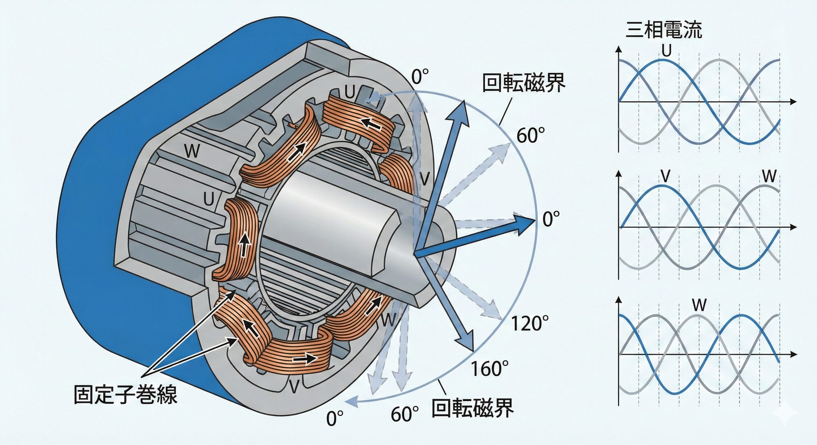 産業用として最も広く普及している三相誘導電動機では、固定子(ステータ)に120度ずつ空間的にずらして配置された三相巻線が存在します。ここに、時間的に位相のずれた三相交流電流を流すことで、固定子の内部空間に一定の速度で回転する合成磁界、すなわち「回転磁界」を作り出します。
