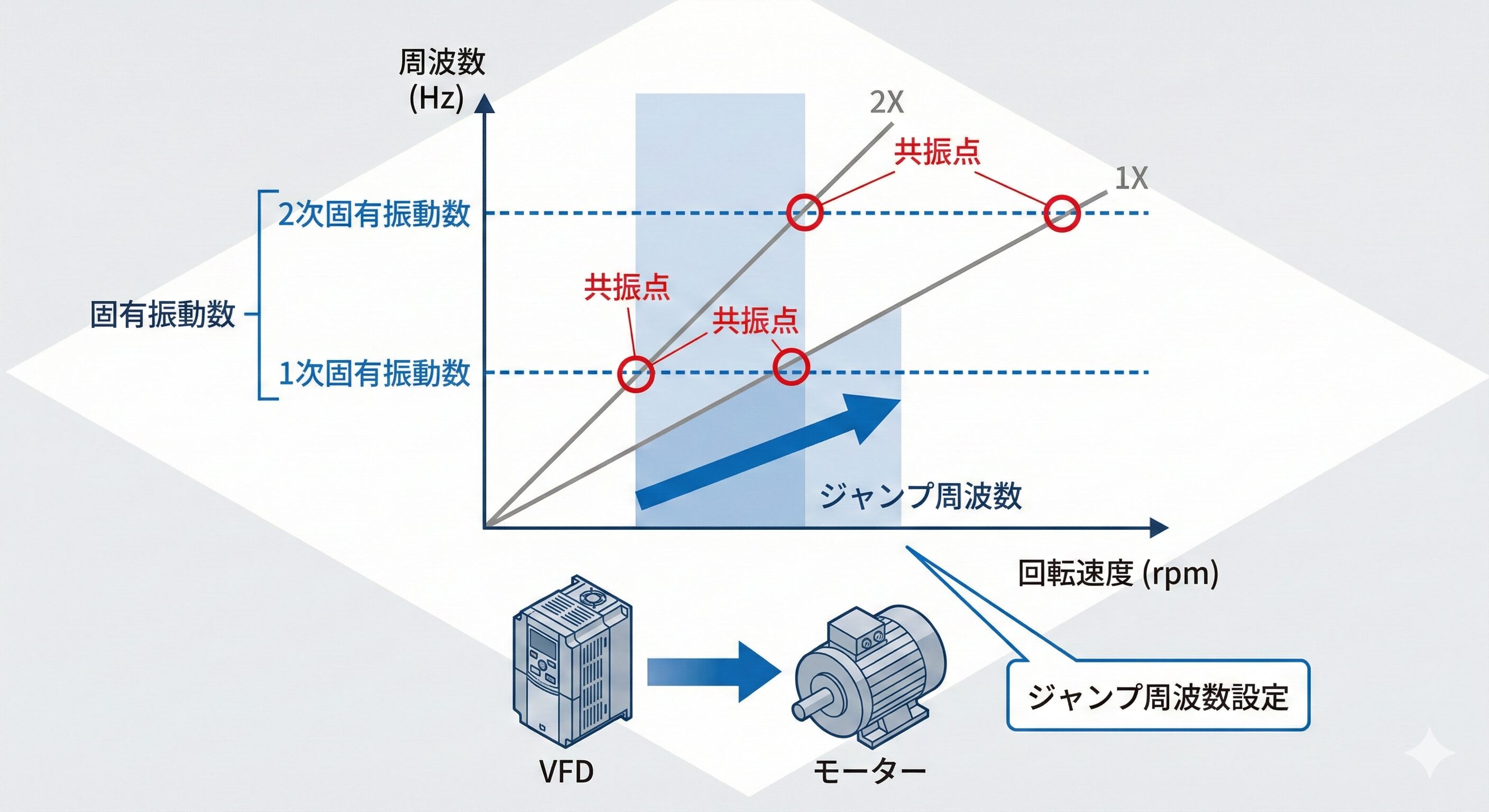 設計・保全エンジニアは、横軸に回転速度、縦軸に周波数をとった「キャンベル線図」を描くことで、この危険な交点(危険速度:クリティカルスピード)を可視化します。現場での実践的な対策としては、インバータのパラメータ設定にある「ジャンプ周波数(スキップ周波数)」機能を活用します。共振が起きる回転速度帯をまたぐように設定することで、モータはその危険な速度帯で連続運転することなく、安全な速度域へと瞬時に移行し、機械的破壊を回避することができます。