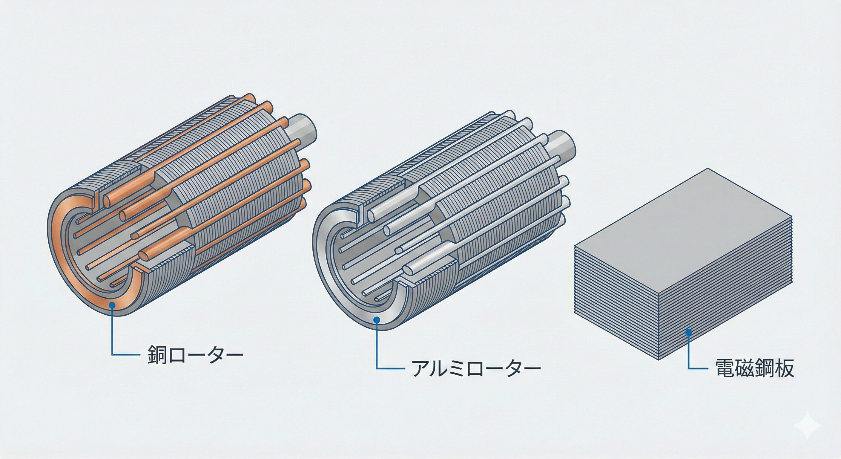 誘導電動機の回転子(ローター)は、製造コストと成形性の観点から長らくアルミニウムダイキャストが標準でした 。しかし、さらなる損失低減の切り札として、導電率に優れる銅(Copper)ローターの採用が拡大しています 。