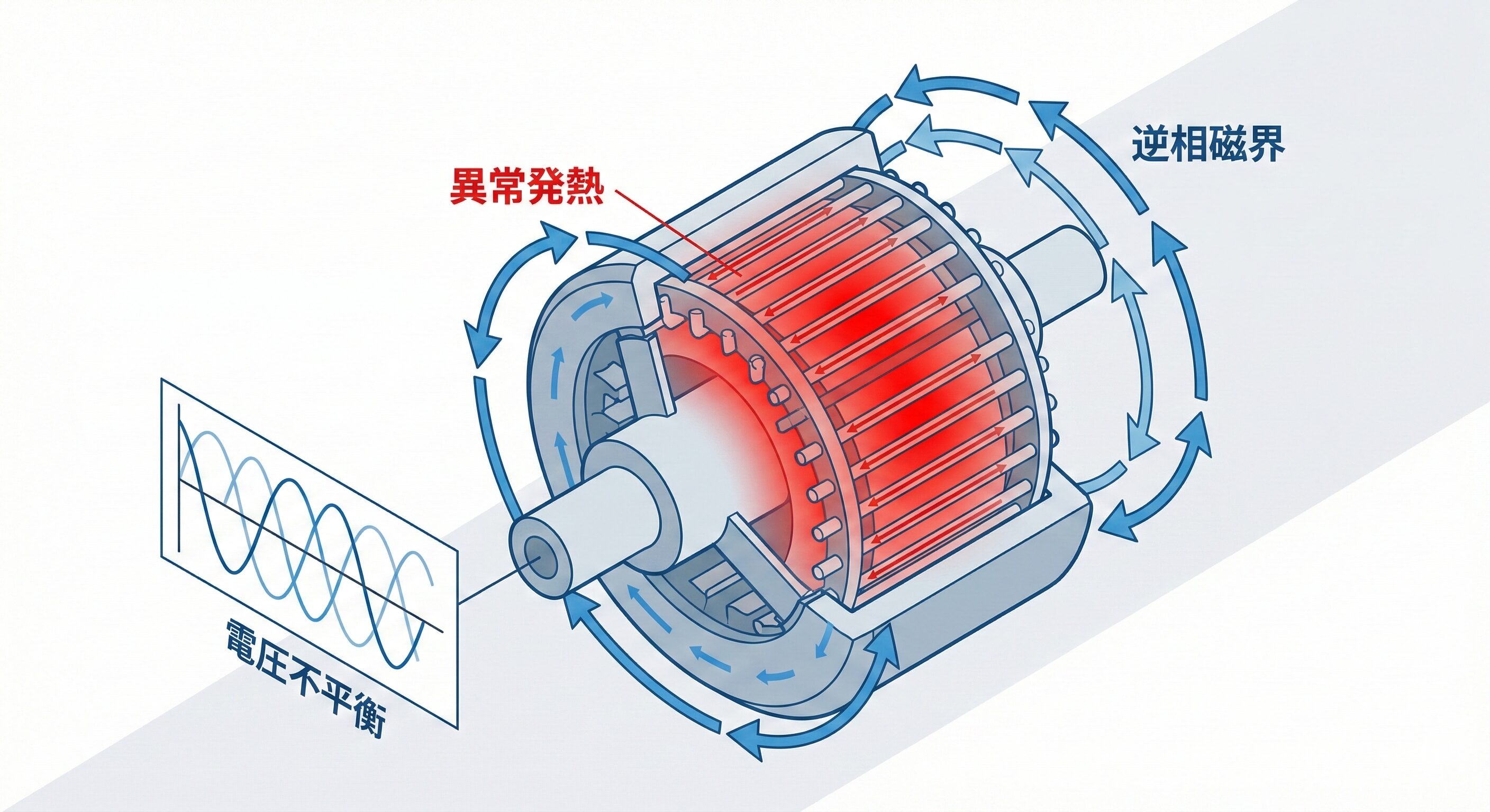 NEMA(米国電気製造業者協会)規格MG1では、電圧不平衡率がわずか1%であっても、モータに悪影響を及ぼすと警告しています。三相電圧に不平衡が生じると、対称座標法における「逆相成分」が発生します。この逆相電圧は、本来の回転磁界とは逆方向に回る磁界を作り出します。